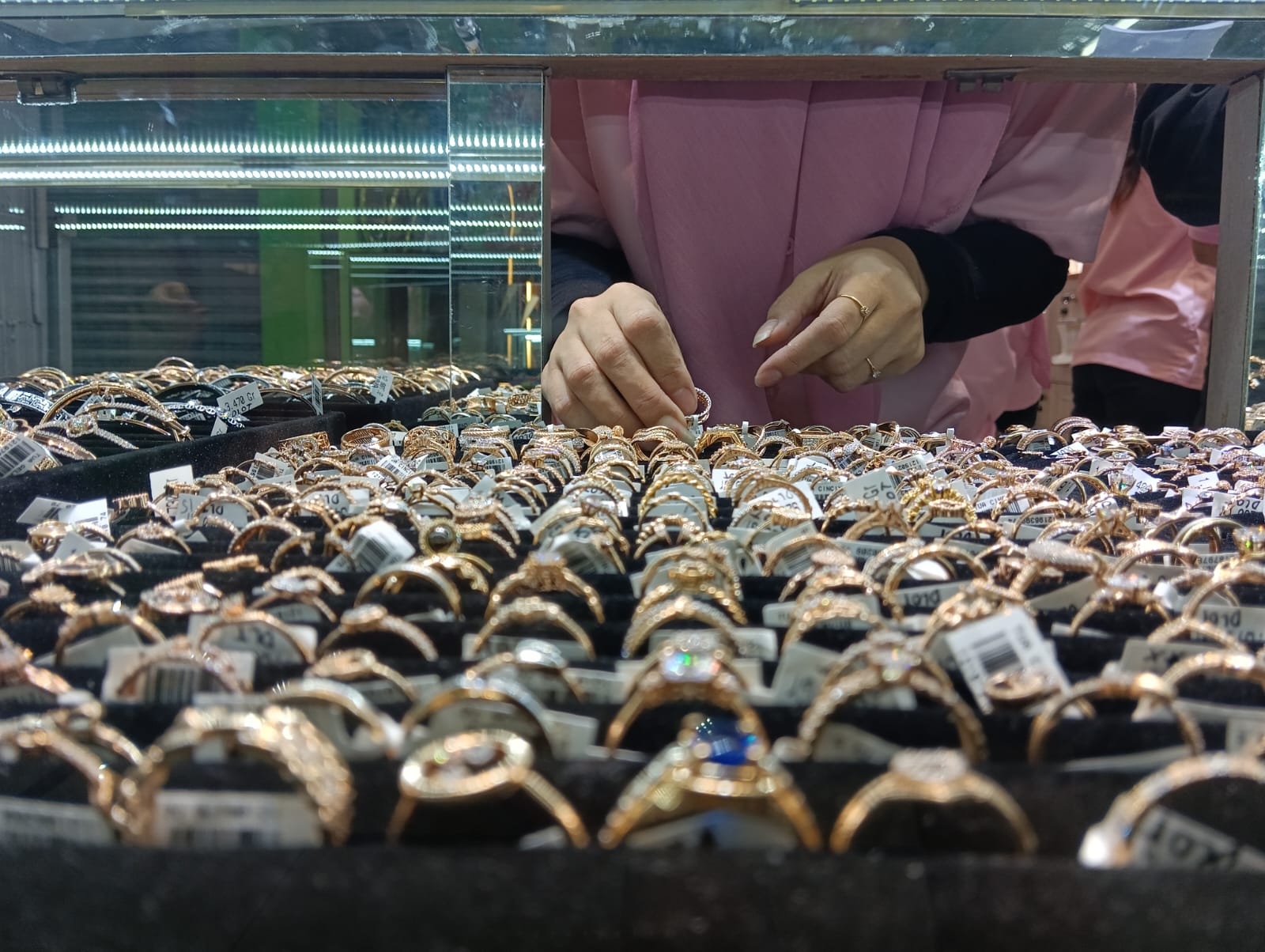 Karyawan Gold N’ Roses cabang ke 22 dari Pantes Group tengah melayani pembelian cincin emas.