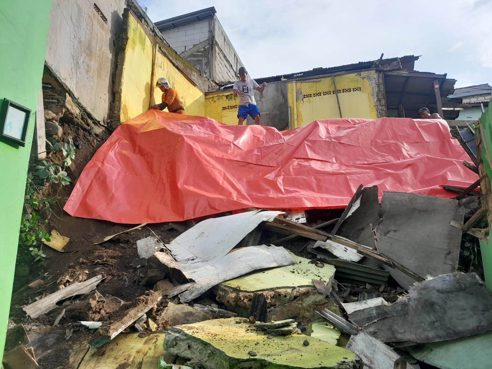 Petugas BPBD tengah memasang terpal di lokasi ambruk rumah kosong di Kelurahan Pasirjaya. Dok. BPBD Kota Bogor.